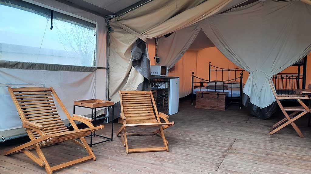 Verder beschikken onze lodgers nog over een overdekt terras van wel ?m² waar u heerlijk kunt genieten van uw koffie en ontbijt in de ochtendzon. Puur genieten!